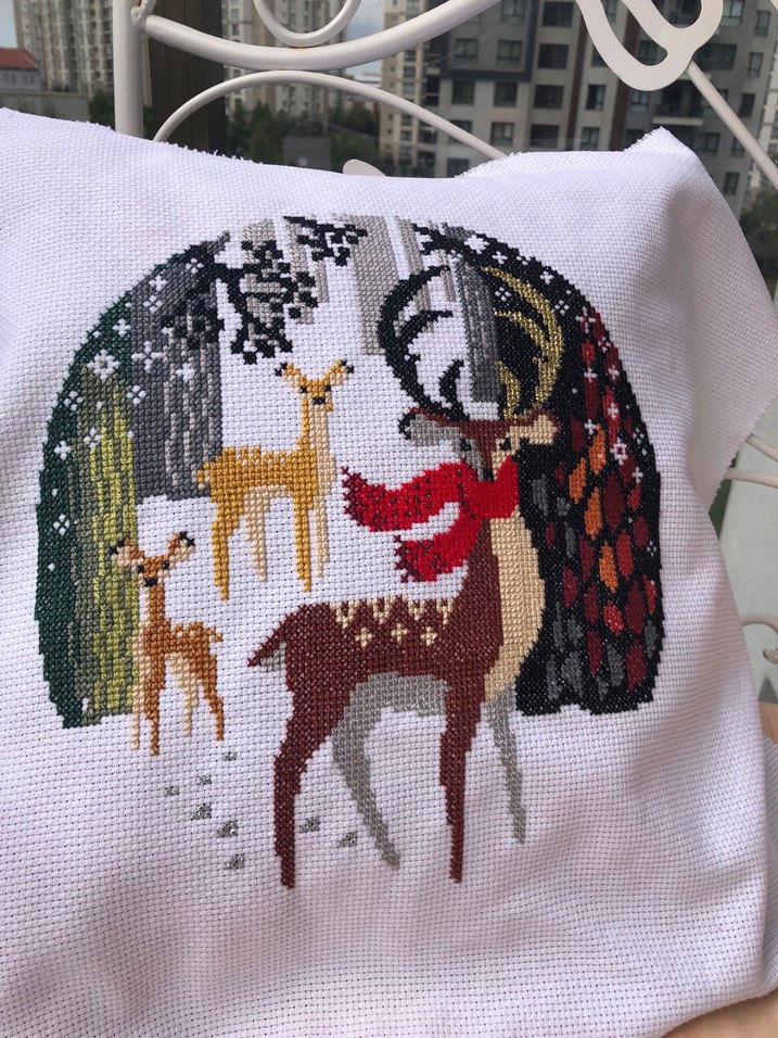 Bu yastık kılıfı, geyik ve ağaç desenlerini koyu, çok renkli ipliklerle nakış olarak sunar. Detaylı işçilik beyaz kumaşa dokulu ve canlı bir görünüm kazandırır.