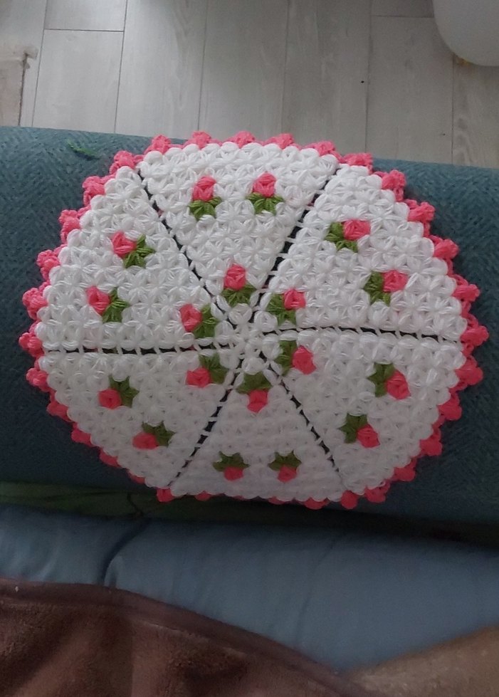 Nakışlı, çok renkli ve pastel tonlarda çiçek desenli yuvarlak masa örtüsü, klasik stile sahiptir.