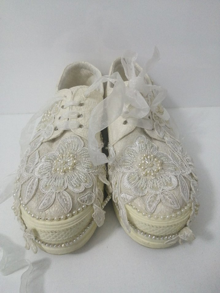 Beyaz renkli kız ayakkabısı, nakışlı örme kumaş ve dantel detaylarla süslenmiştir. İnci süslemeleri ve kurdele bağcıkları bulunmaktadır. 38 numara