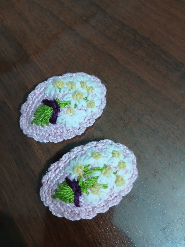 Nakışlı çiçek desenli, dantel kenarlı pastel renklerde çocuk tokası seti. Bohem tarzını yansıtır.