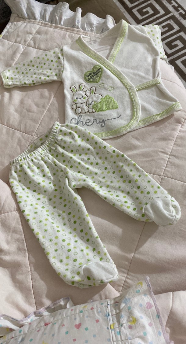 Pamuklu, uzun kollu, pastel yeşil renkte, nakışlı ve dantel detaylı bebek erkek takımı. Rahat ve yumuşak kumaş kullanılmış.