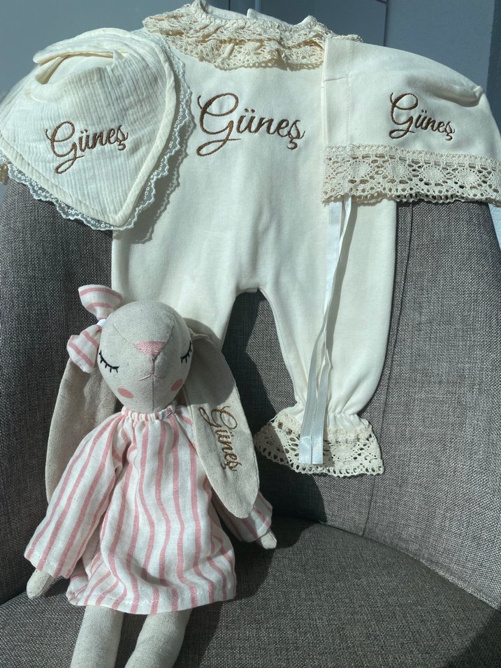 Beyaz renkte, dantel ve nakış detaylı bebek kız hastane kıyafeti. İsim işlemeli, pastel tonlarda tulum, şapka, önlük ve uyku arkadaşı içerir.
