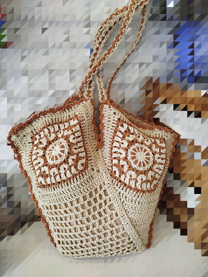 Nakışlı ve dantel detaylı, bej renkli örgü kadın çanta. Bohem tarzıyla günlük kullanıma uygundur. genişlik 48cm
