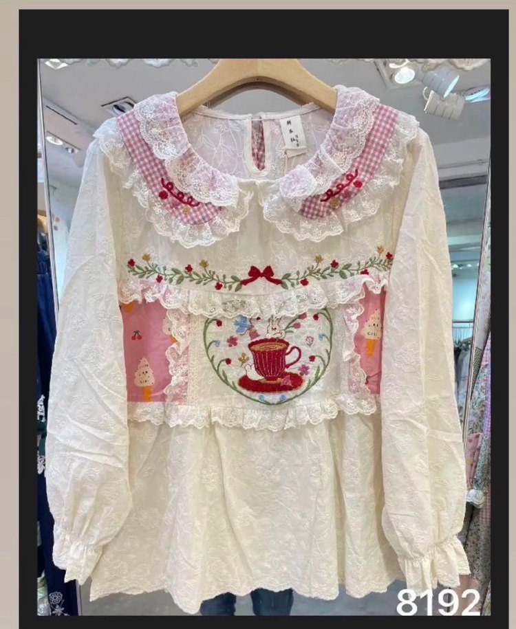 Pamuklu beyaz uzun kollu kız bluzu, bol kesim ve yuvarlak yaka. Nakışlı çiçek ve fincan desenleri, dantel ve pastel pembe detaylarla bohem tarzı yansıtıyor. ☕