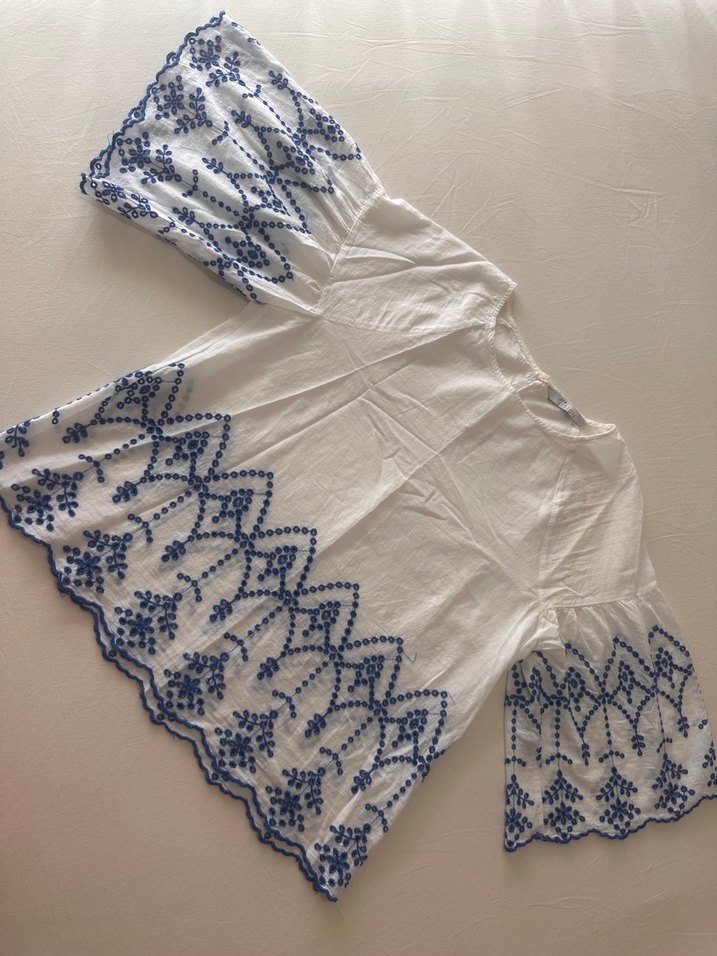 Mavi nakış ve dantel detaylı, kısa kollu, V yaka, pamuklu beyaz mini bohem bluz. Rahat kesim ve hafif dokusuyla günlük kullanıma uygun.