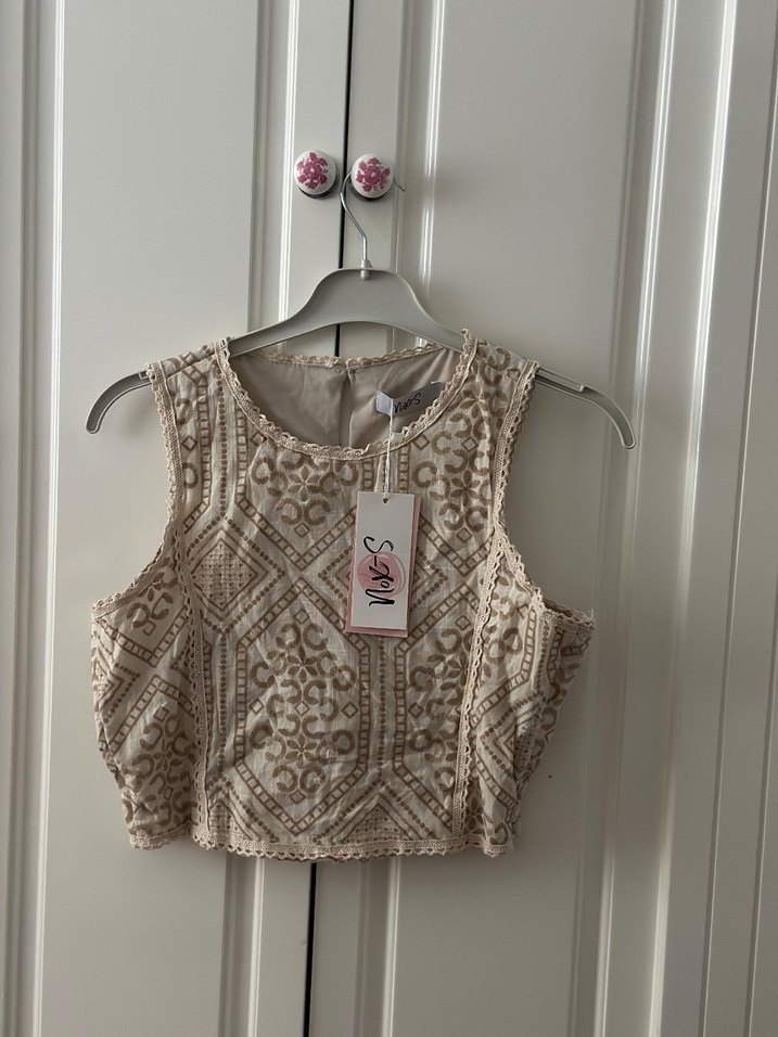 Dantel ve nakış detaylı, bej renkli, straplez, bohem tarzda, yumuşak örme kumaştan yapılmış, kolsuz ve vücuda oturan yelek.