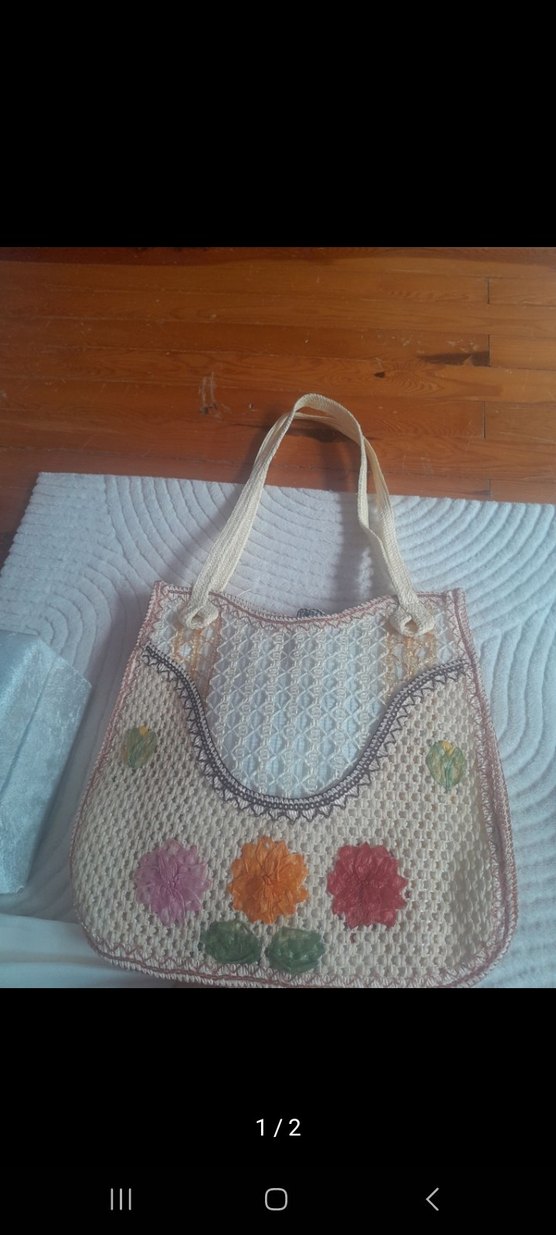 Nakışlı çiçek desenleri ve dantel detaylarıyla örme kumaştan yapılmış pastel çok renkli bohem kadın çantası, günlük kullanıma uygundur.