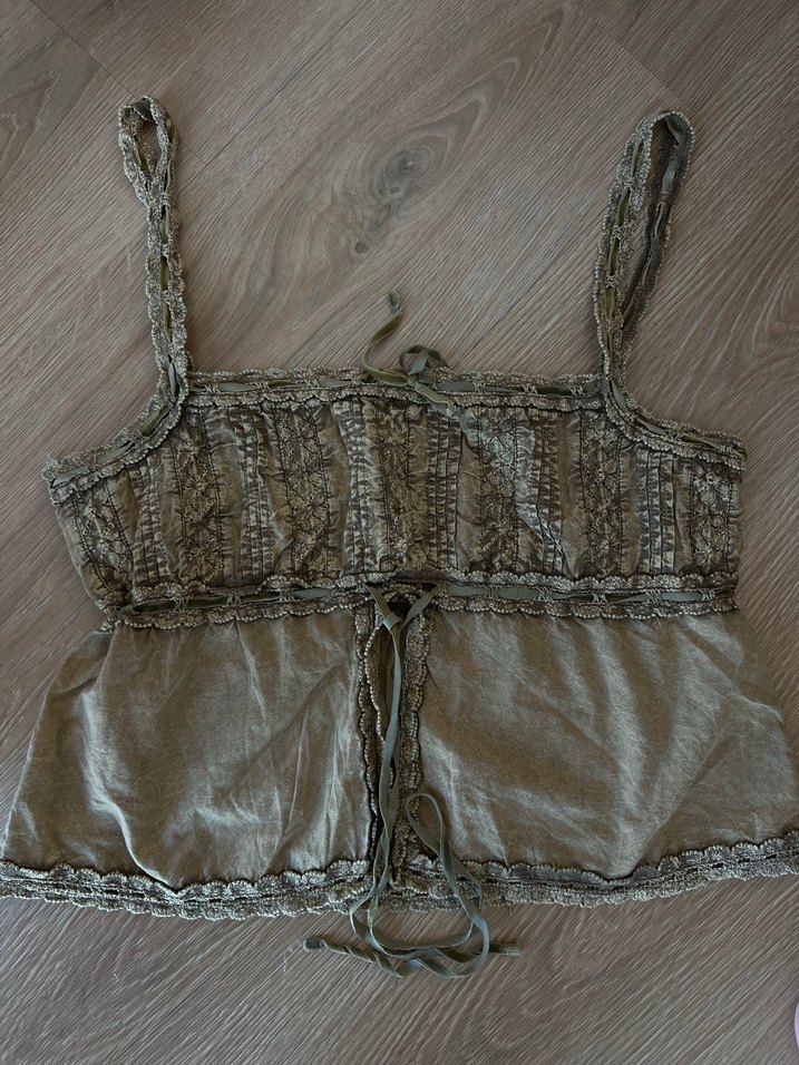 Nakışlı desenler ve dantel detaylarıyla ketenden yapılmış, bej renkte oturan bustiyer. Askılı ve straplez yaka, bohem ve vintage tarzda. ✨