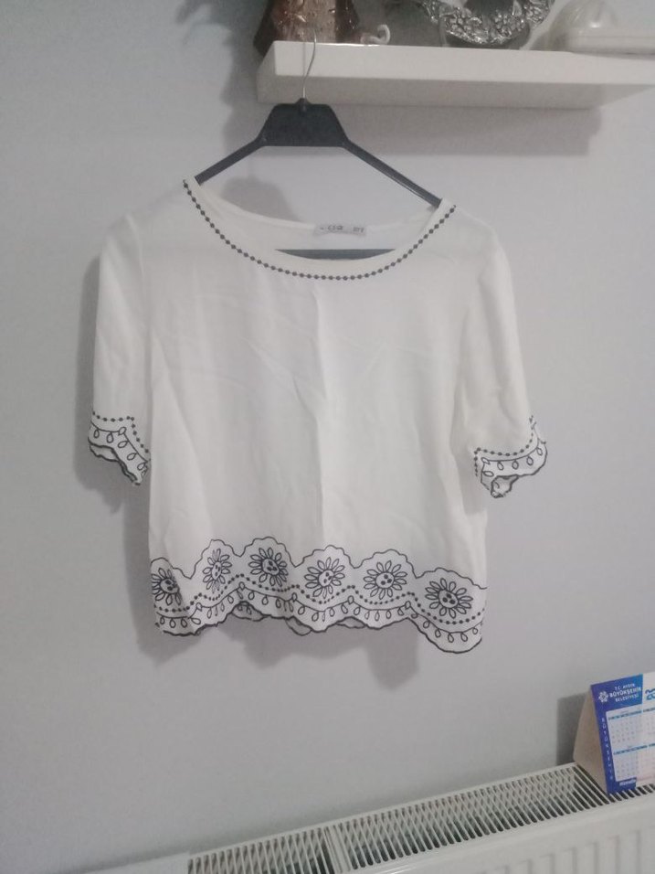 Pamuklu, kısa kollu, yuvarlak yakalı, bol kesim beyaz bluz. Kollarında ve uç kısmında nakışlı dantel detaylar bulunur. Bohem tarzını yansıtır.
