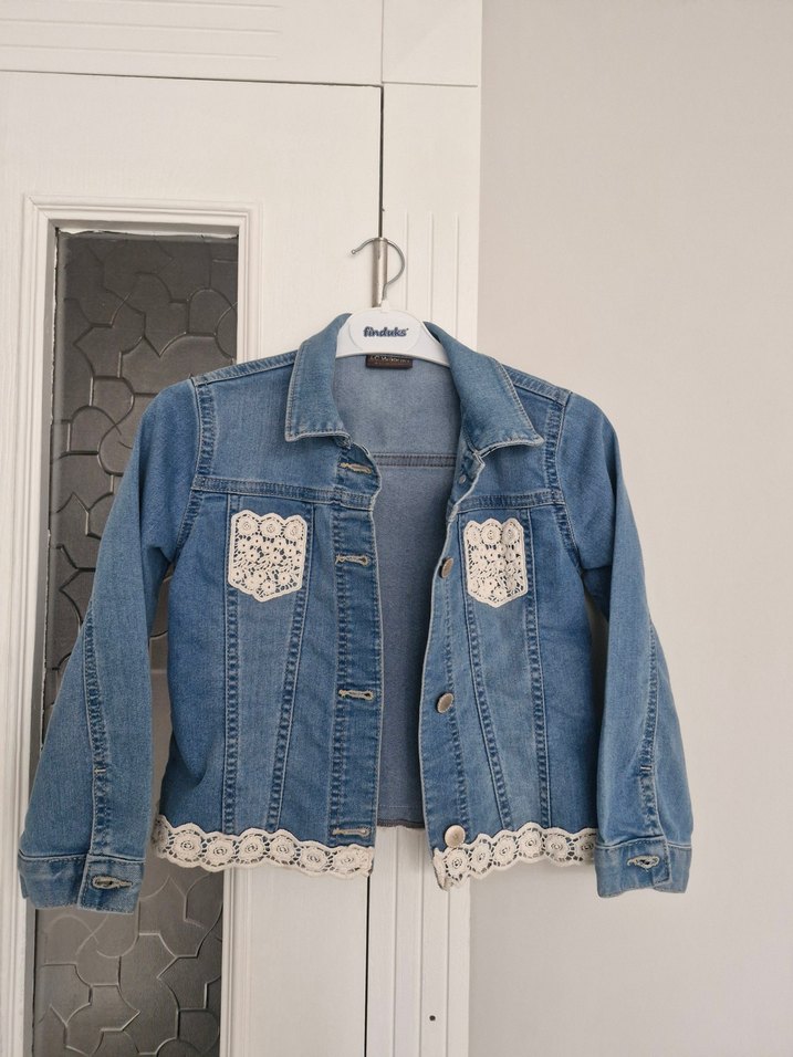 Nakışlı desenlere ve dantel detaylarına sahip kız kot ceketi. Notlu yaka ve regular kesim, mavi renkte.