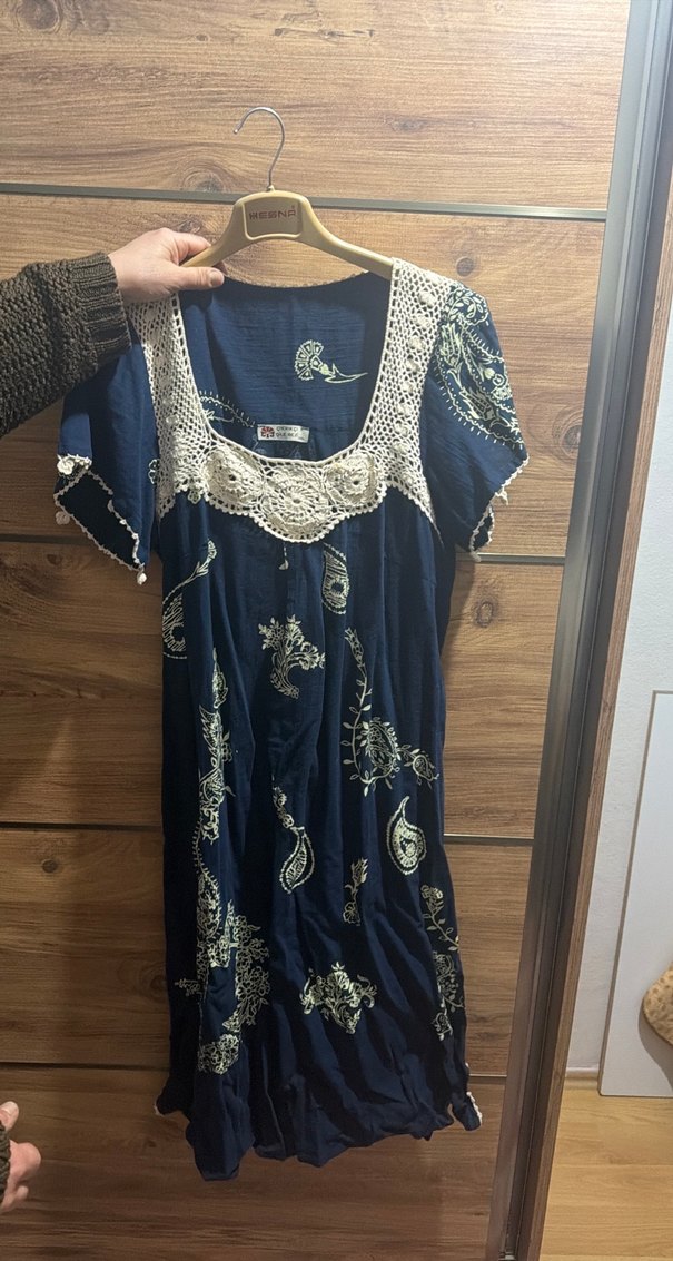 Lacivert renkte, nakışlı desenlere ve dantel detaylarına sahip, bol kesim uzun elbise. Tekstil kumaştan, kısa kollu ve kayık yaka tasarımlı, günlük kullanıma uygun.