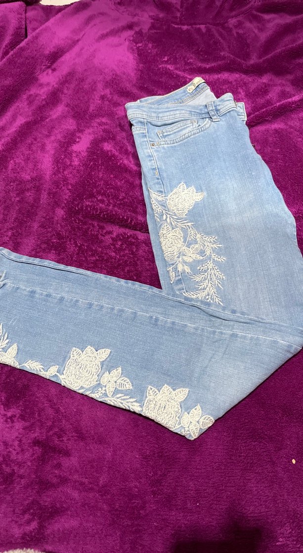 Mavi denim kadın kot pantolon, nakışlı ve dantelli detaylara sahip. Bohem tarzında, normal boy ve regular fit, günlük kullanıma uygun.
