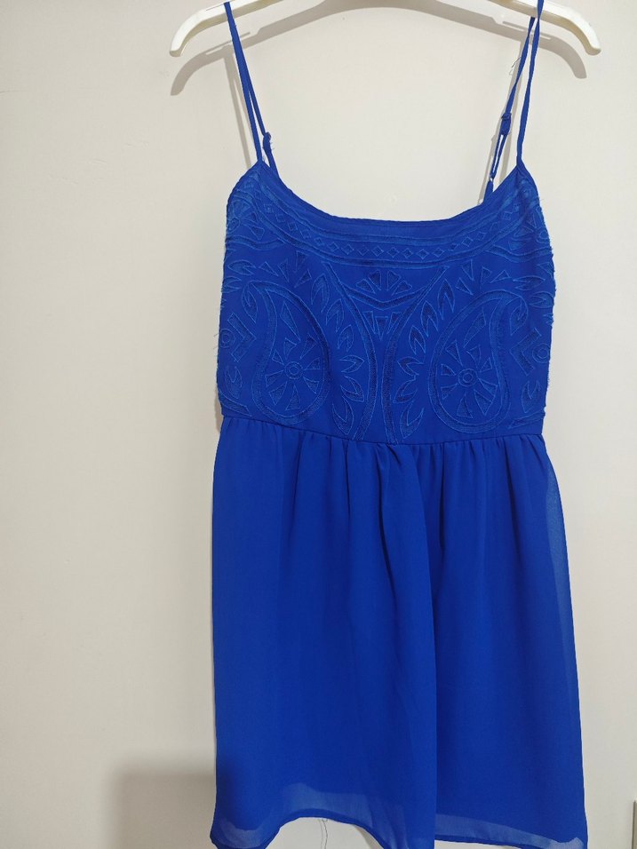 Nakışlı dantel detayları ve askısız yakasıyla bohem tarzda, salaş kesim mavi midi gecelik
