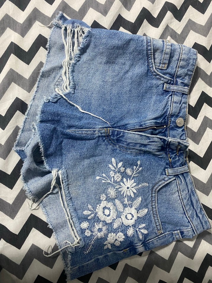 Mavi kot şort, beyaz çiçek nakışı ve dantel detaylara sahiptir. Bol kesim ve mini boyda, Bohem tarzına uygundur.