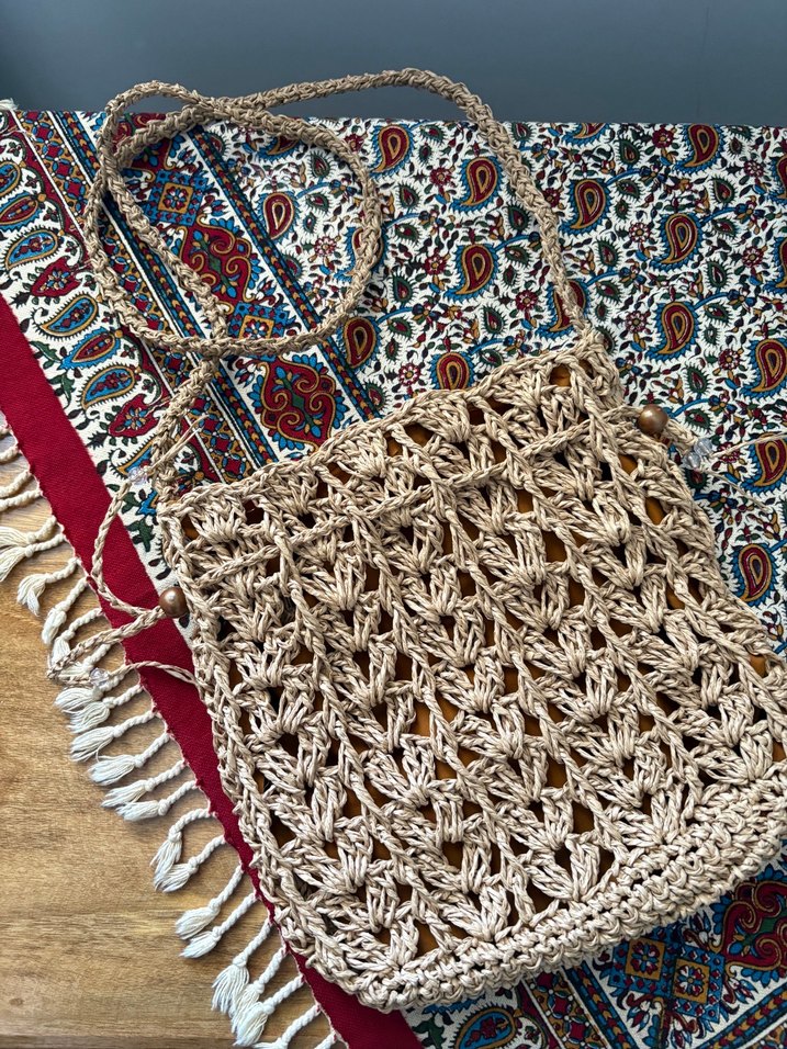 Hafif çok renkli, nakışlı dantel detaylı örgü bohem kadın çanta, günlük kullanım için uygun.