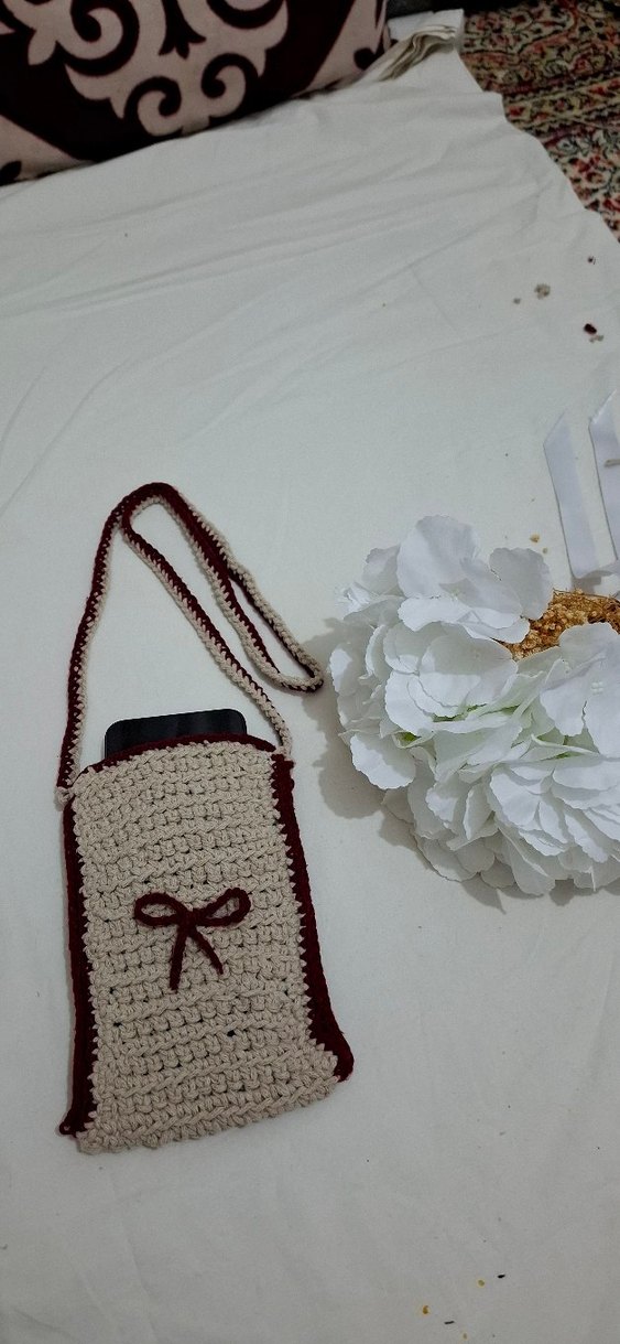 Açık kahverengi örgü çapraz çanta, nakışlı desenler ve dantel detayları ile bohem tarzda, uzun askılı.