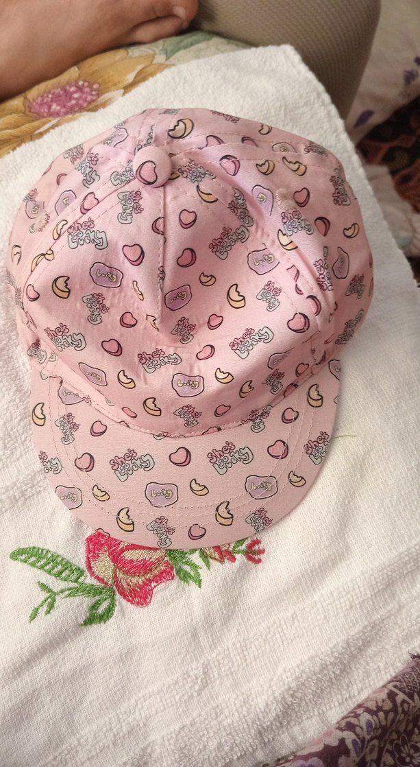 Pastel pembe renkte, nakışlı kalp ve yazı desenleri bulunan, dantel detaylı, yumuşak sentetik kumaştan yapılmış çocuk şapkası.