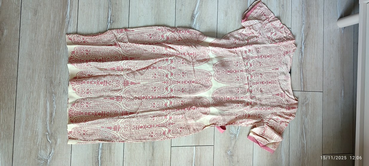 Nakışlı desenler ve dantel detaylarına sahip uzun, dar kesim pembe hamile tunik. Kayık yaka ve kolsuz tasarımıyla bohem tarzı yansıtıyor.