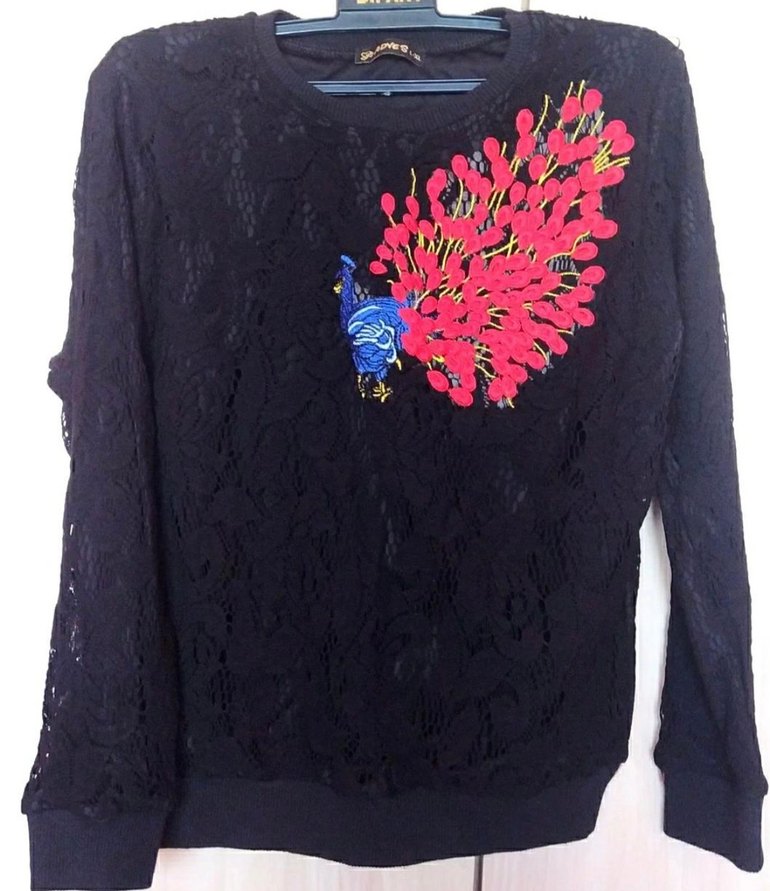Uzun kollu, dantel detaylı siyah triko bluz. Canlı nakışlı tavuskuşu deseni ve bohem stil ile rahat kesim.L beden ama dar kalıp.