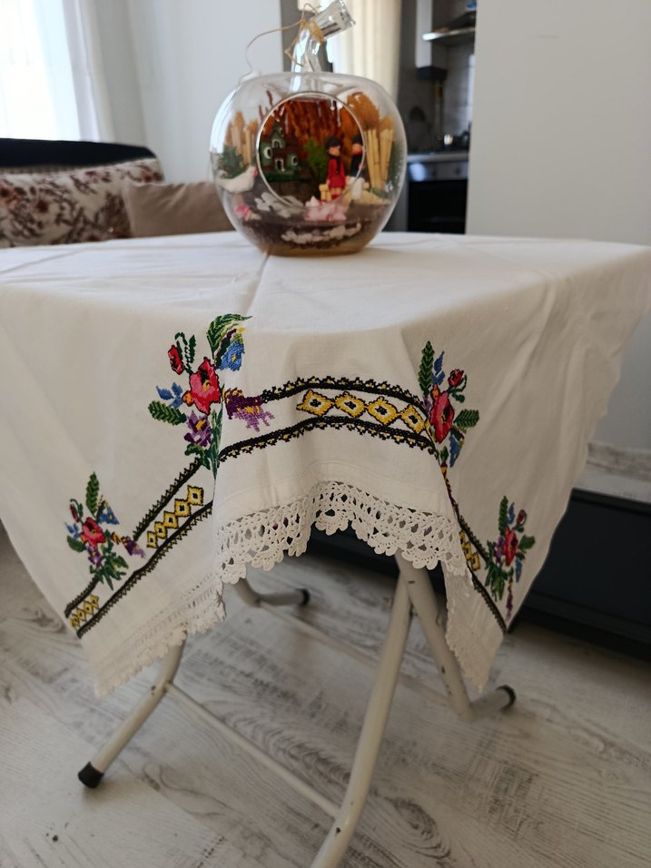 Bu masa örtüsü, geleneksel çiçek nakışı ve zarif dantel kenarı ile klasik bir dokunuş sunar. tamamen el emeği göz nuru