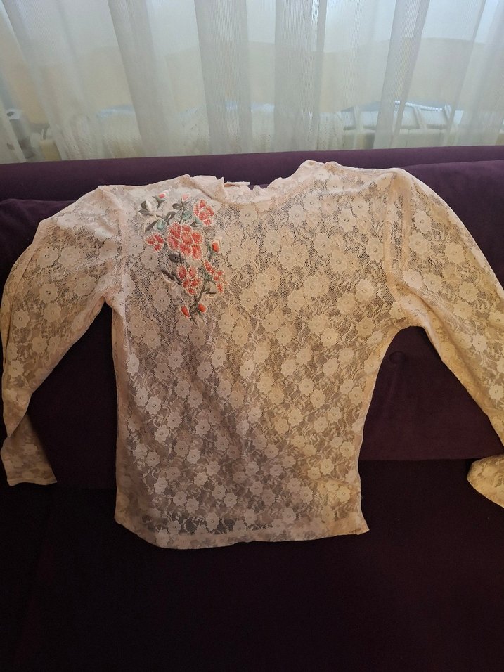 Beyaz renkli, uzun dantel kollu, yuvarlak yakalı ve nakışlı çiçek desenli bohem tarzı vintage bluz. Rahat kesimli ve günlük kullanıma uygun.