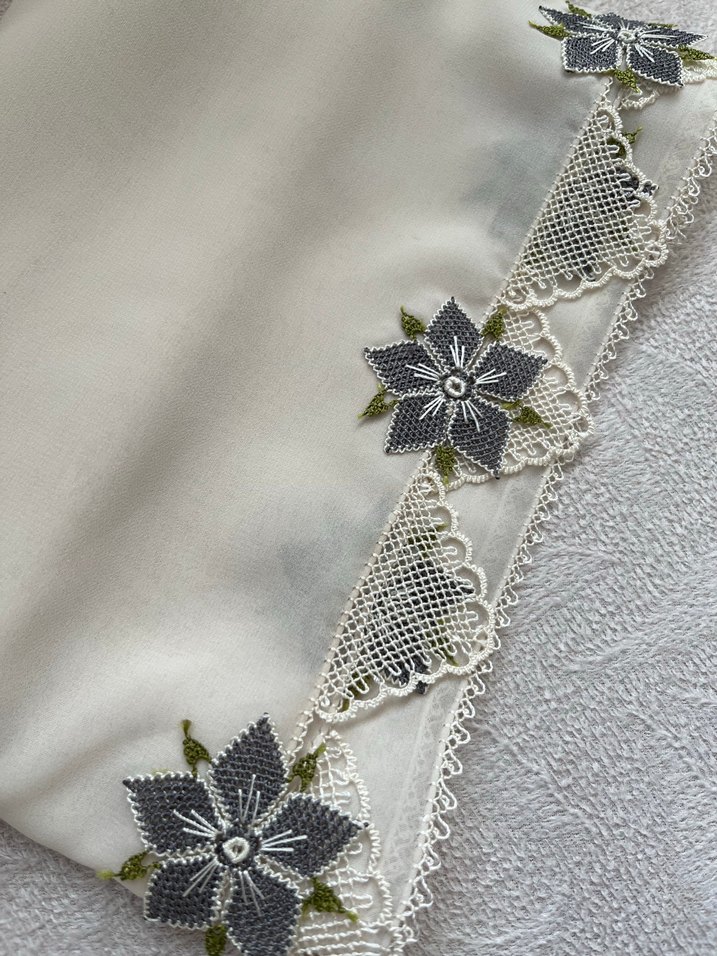 Nakışlı gri çiçekler ve dantel detaylı kadın broşu, vintage ve bohem tarzıyla düğünler için uygundur.