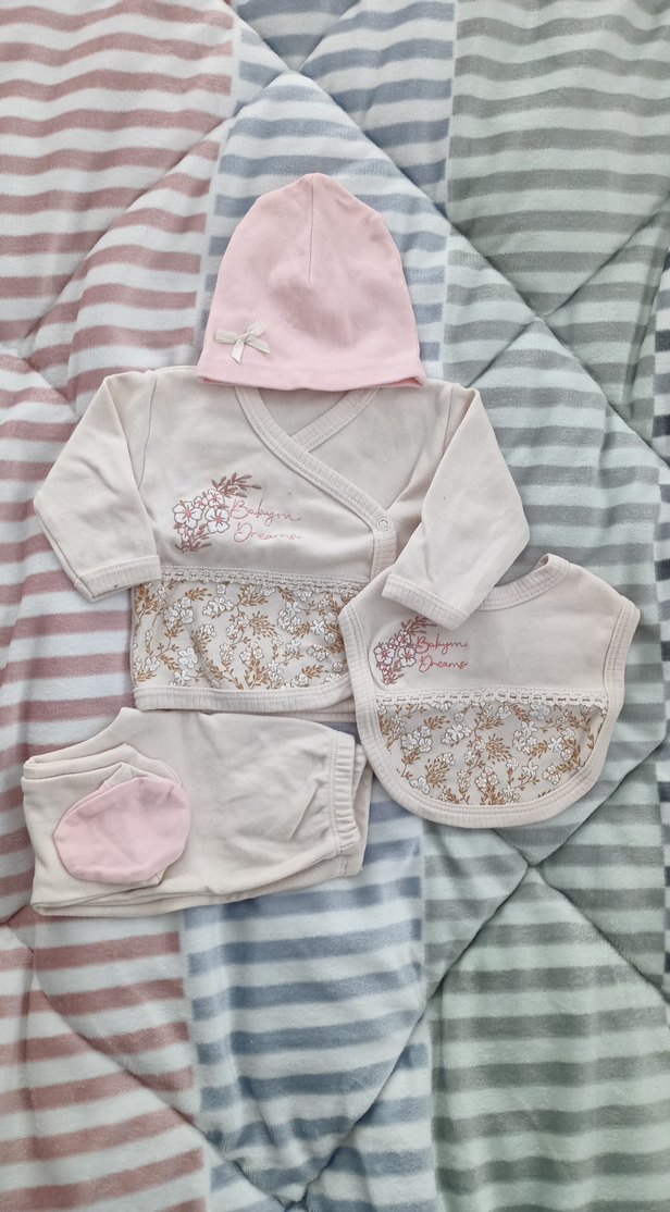 Uzun kollu, nakışlı ve dantelli pembe bebek kız takımı; pantolon, önlük ve küçük fiyonk detaylı şapka içerir. Pastel tonlarda yumuşak bir görünüm sunar.