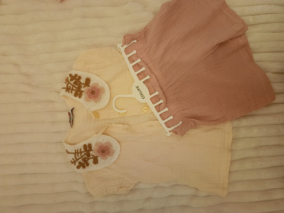 Nakışlı çiçek detaylı ve dantelli, pastel bej renkte kız bebek takımı. Kısa kollu üst ve yumuşak pastel askılı alt parçadan oluşur.