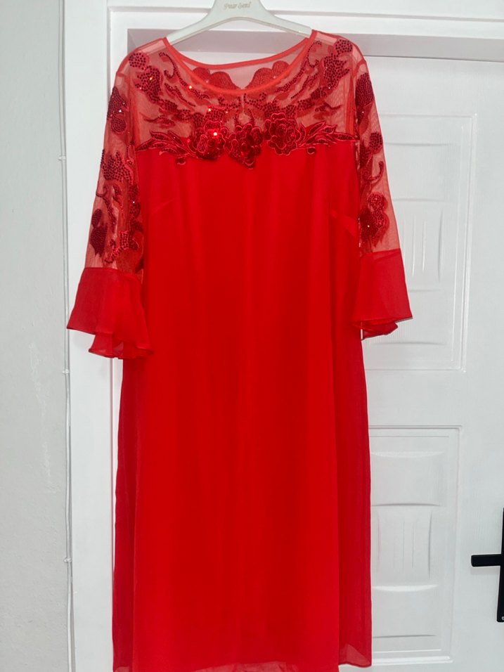 Nakışlı dantel detaylı, tekne yakalı nar çiçeği rengi uzun abiye elbise. Kısa kollu ve bol kesim, düğün gibi özel anlara uygundur. Beden 46 ama 44 uyumludur