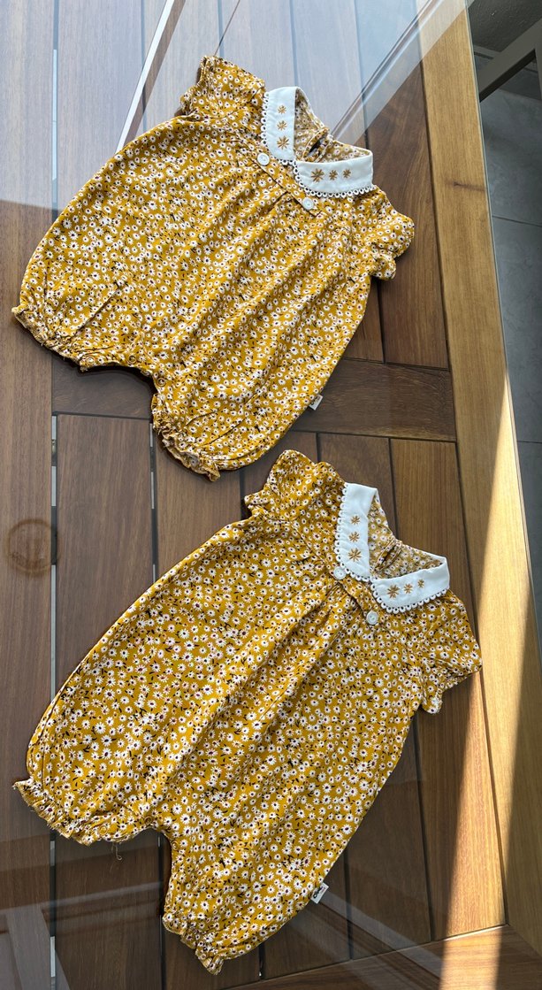 Sarı renkli, nakışlı çiçek desenli, dantelli yakalı bebek tulumu. Yumuşak kumaş, büzgülü kol ve paça detaylarıyla.
