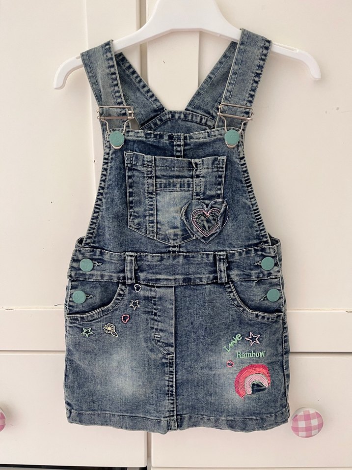 3 yaşKız çocuklar için nakışlı, askılı ve tokalı, fitted kesim denim elbise. Cepleri ve kalp nakışı ile renkli detaylar içerir. Trend sokak stili.