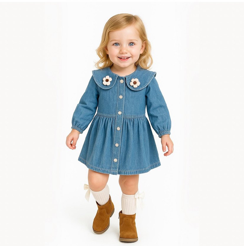 Bol kesim, uzun kollu kız çocukları için denim elbise. Yaka kısmında nakışlı çiçek detayları ve düğmeli ön tasarım bulunur. 1-2-3-4 yaş beden seçenekleri