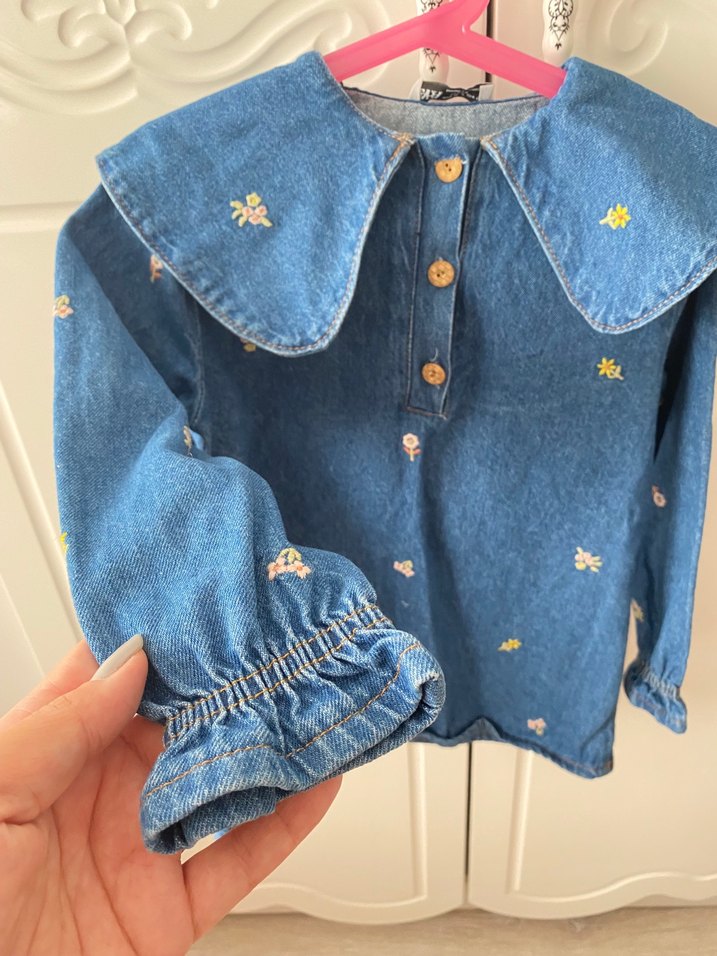 Mavi pastel renkli, nakışlı denim kız elbisesi. Geniş kesim, uzun kollu, düğmeli ve yakalı tasarımıyla dikkat çeker.