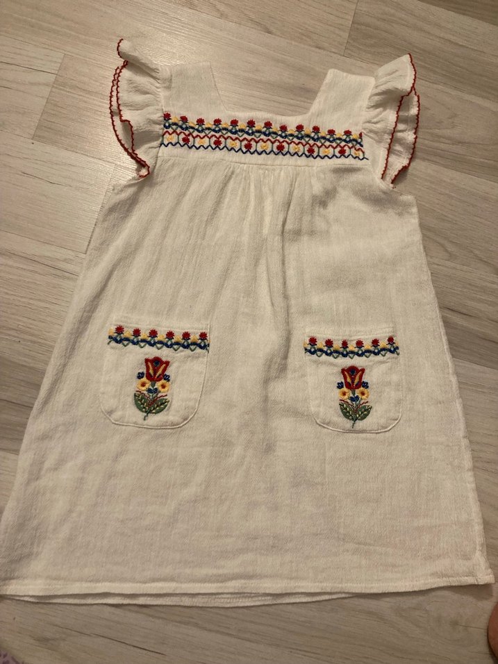 Nakışlı detaylara sahip, kayık yaka ve kolsuz bohem tarzda hafif renkli kız çocuk elbisesi.Beden 3-4 Yaş diyor ama ben 1.5 yaş da giydirdim