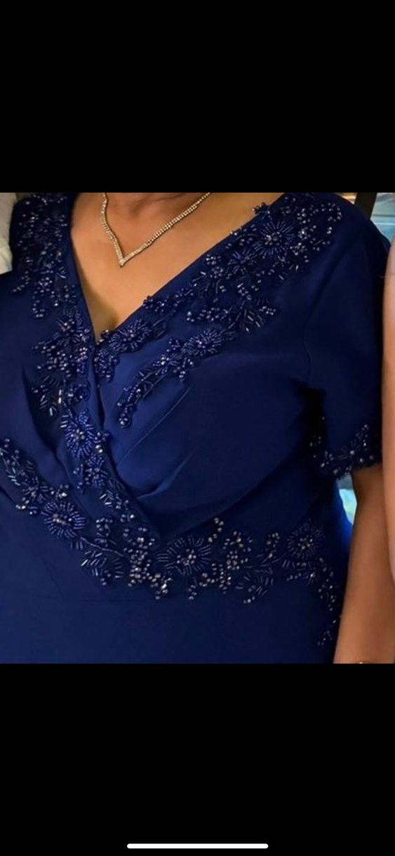 Lacivert saks mavisi renkte, V yakalı ve kısa kollu abiye elbise. Nakışlı desenli, drapeli ve vücuda oturan midi boy, düğün ve özel günler için uygundur.