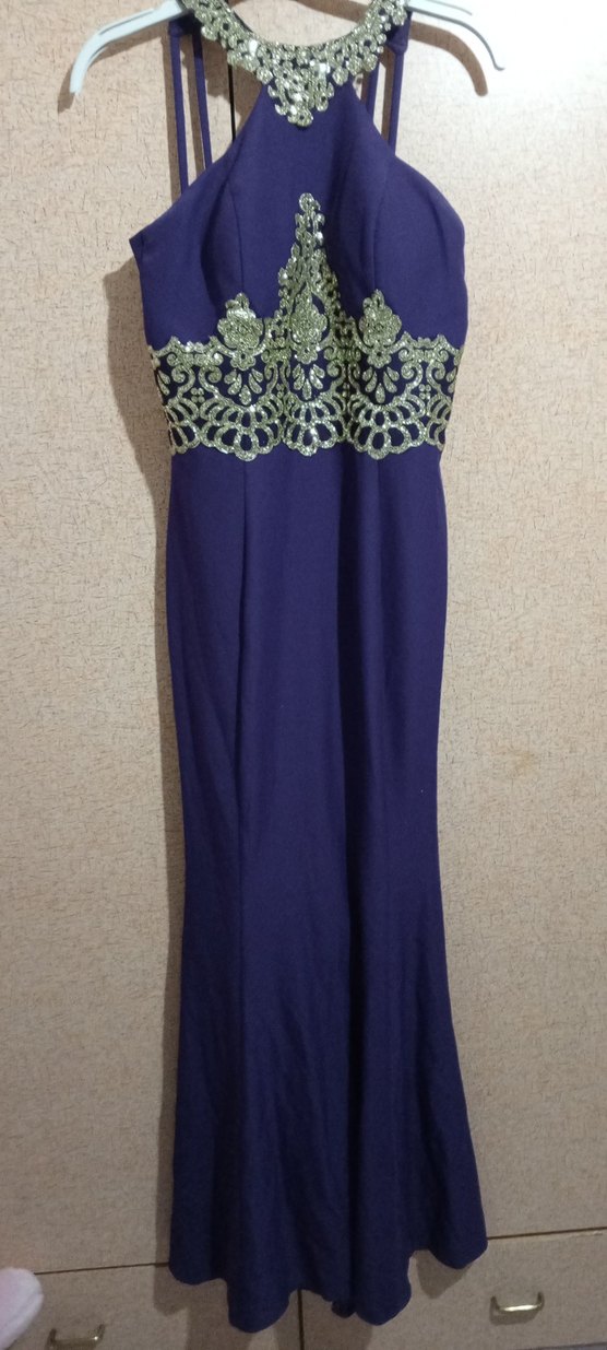 Lacivert, drapeli ve nakışlı, straplez ve kolsuz uzun abiye elbisedir. Düğünler için uygun, modest ve klasik tarzda bir tasarımdır.