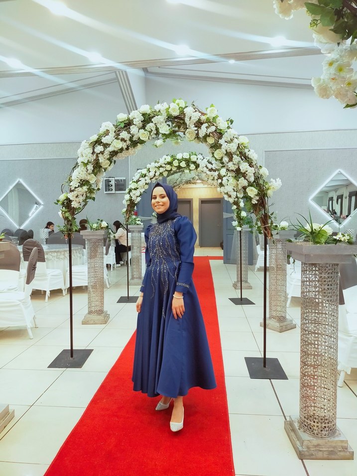 Nakışlı detaylara sahip lacivert uzun abiye elbise, uzun kollu ve yakası notched lapel. Drapeli tasarımı ve regular fit kesimiyle düğünler için uygun. (S BEDEN AMA M bedene de olur )