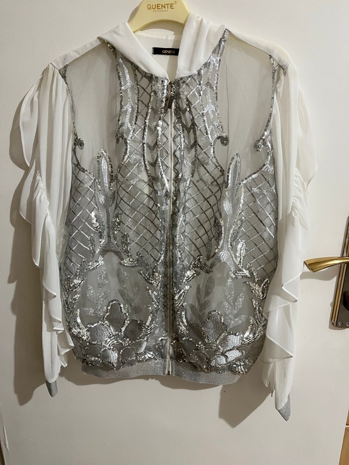 Beyaz, askısız, salaş kesim mini bluz. Nakışlı detaylar ve drapeli tasarımla, düğün için uygun. Sentetik kumaştan, bohem tarzında. 42 bedene kadar uygundur