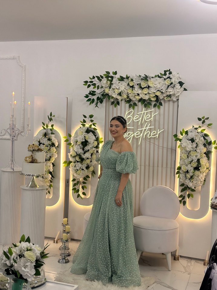 Bu açık haki nişan elbisesi, drapeli detaylar ve kısa kollu bol kesimle tasarlanmıştır. Straplez yaka ve nakışlı deseniyle bohem tarzı yansıtır.