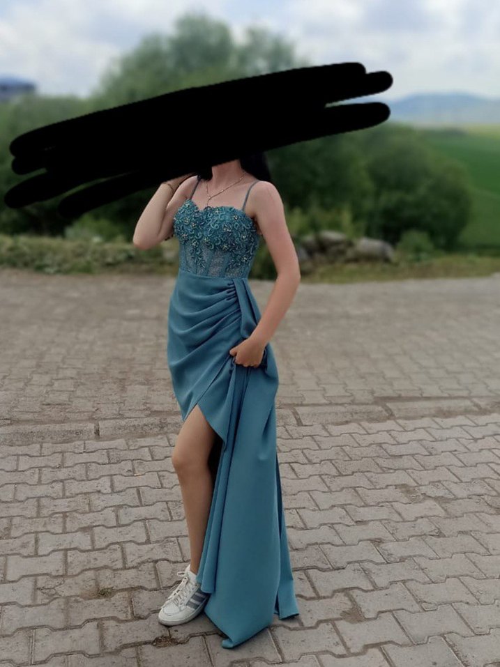 Nakışlı Drapeli Turkuaz Uzun Abiye Elbise