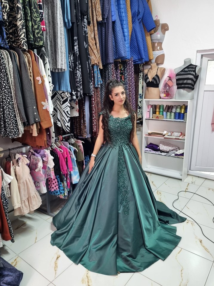 Askılı olmayan, drapeli ve nakışlı desenlere sahip parlak haki renk uzun abiye elbisedir. Kolsuz ve klasik kesimle düğünler için uygundur. 3 saatliğine giyilmiştir meşale düştüğü içim ufak bir delik vardır ama belli olmuyordur