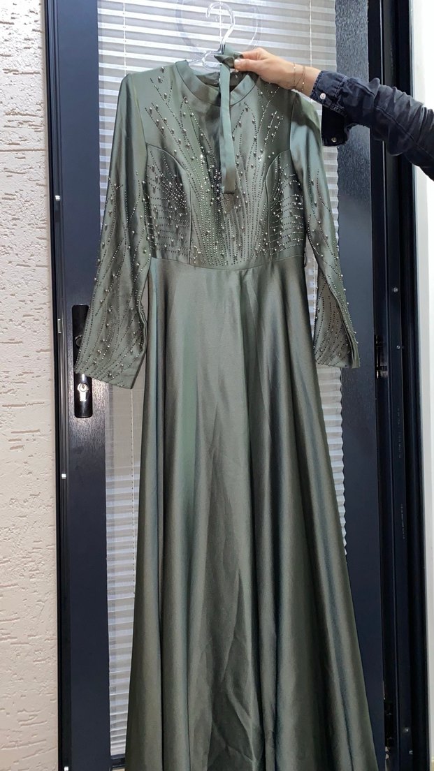 Bu haki uzun kol abiye elbise, tekne yaka ve nakışlı detaylara sahiptir. Drapeli tasarımı ve regular kesimiyle düğünler için klasik şıklık sunar. ✨