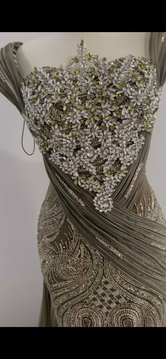 Bu oturan kesim haki abiye elbise, detaylı nakışlar ve drapeli tasarıma sahiptir. Straplez yaka ve askılı kollu, bohem tarzda düğünler için uygundur.