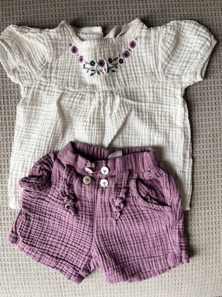 Nakışlı çiçek detaylı, düğmeli kısa kollu üst ve cepli, düğmeli pastel mor dokulu şorttan oluşan bebek kız kıyafet takımı. 12 18 ay müslin nakışlı