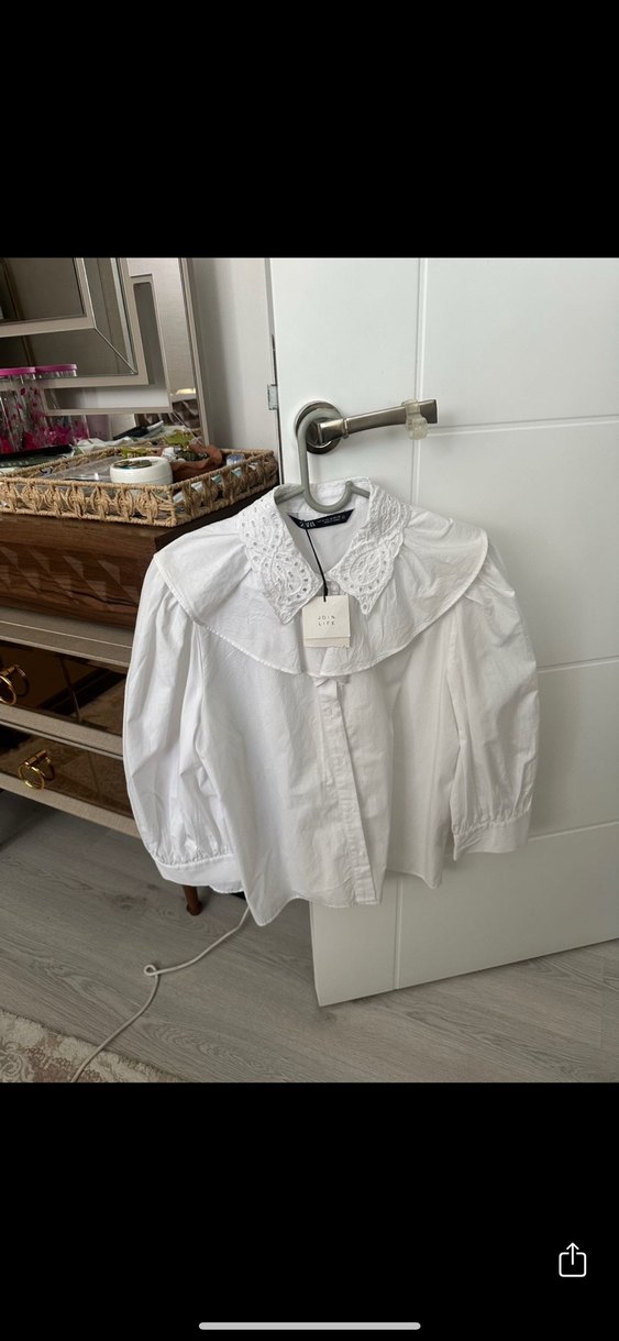 Pamuklu, düğmeli, nakışlı detaylara sahip bol kesim beyaz kadın gömlek. Kısa kollu ve yakalı, günlük kullanıma uygun.