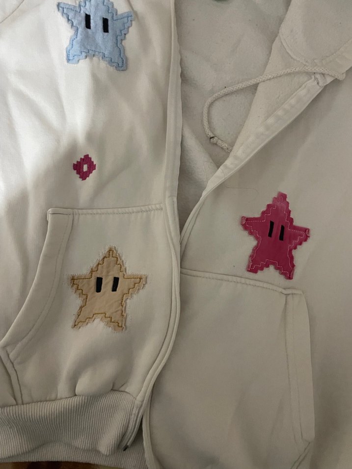 Hafif tüylenmeler mevcut Nakışlı yıldız desenli, düğmeli, notlu yaka ve uzun kollu beyaz kadın sweatshirt. Yumuşak dokulu, bol kesim ve rahat tarzda.