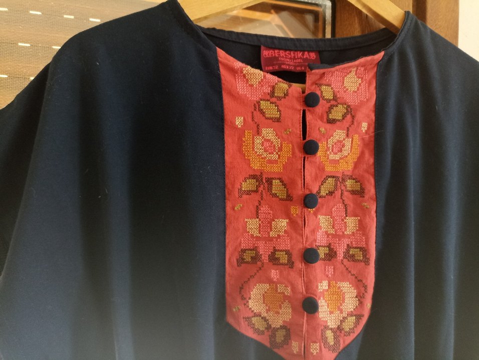 Koyu kırmızı, düğmeli ve nakışlı ön kısmı olan, kolsuz, yakası kesik hamile tunik. Bol kesim ve uzun boylu, günlük kullanıma uygun bohem tarzda.