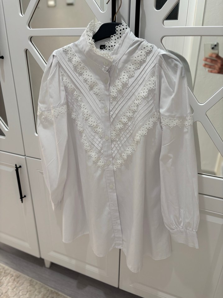 Nakışlı detaylara sahip beyaz bohem tarzı kadın gömlek, yakalı ve uzun kolludur. Pamuk kumaştan üretilmiş, düğmeli ve bol kesimdir, günlük kullanıma uygundur.