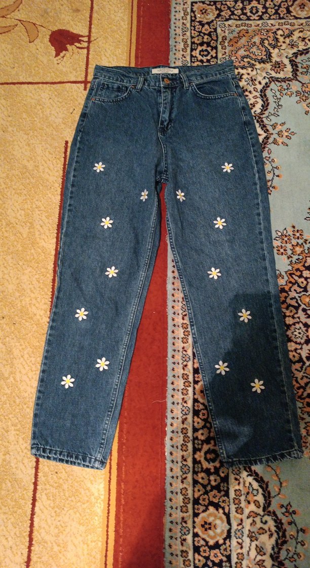 hacker 29 beden güzel yeni gibi kaliteli önü papatya desenli sayılı giyildi alıcısına şimdiden hayırlı olsun Koyu mavi denimden, nakışlı çiçek desenleri ve düğmeli ön kısmı olan, bol kesim midi uzunluğunda bohem tarz kadın kot pantolon. az kullanılmıştır