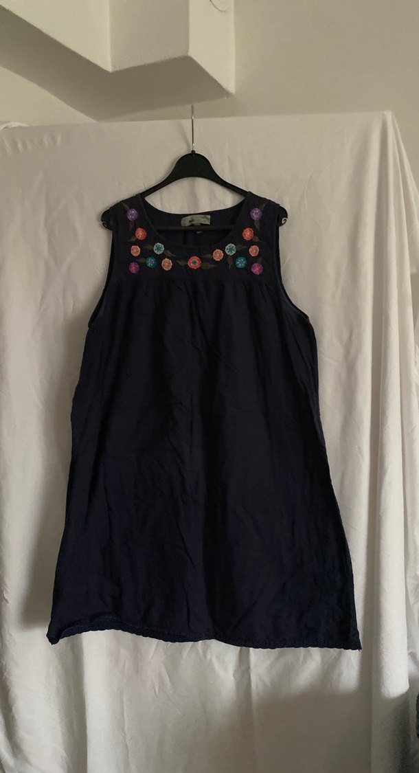 Kolsuz, bisiklet yaka, renkli nakış detaylı bohem midi elbise. Düğmeli ve bol kesim, tekstil kumaştan üretilmiştir. Günlük kullanım için uygundur.